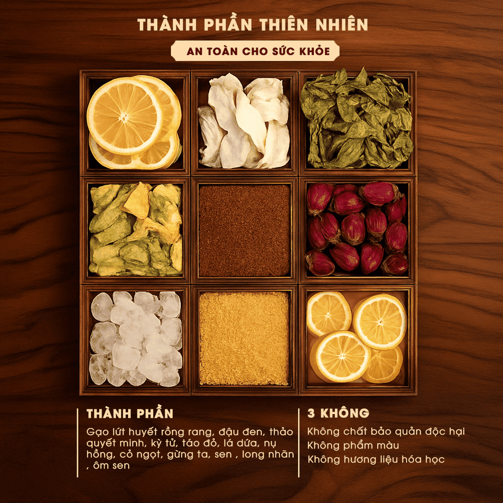 ❖ Thành phần: Gạo lứt huyết rồng, Đỗ Đen Xanh Lòng, Hoa Cúc Vàng, Nụ Nhài, Nụ Hồng, Táo Đỏ, Hoa Đậu Biếc, Cỏ Ngọt, Lá Dứa