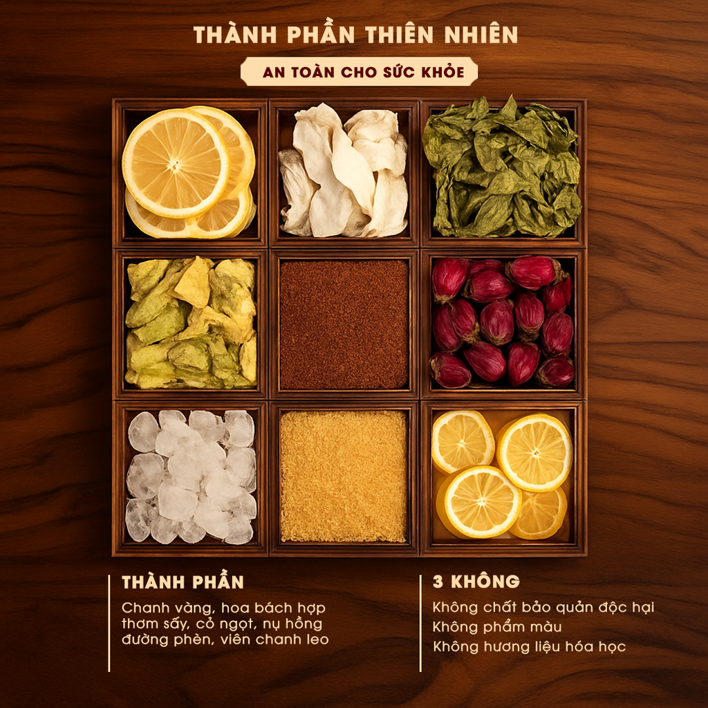 ❖ Thành phần: Chanh vàng, Hoa, bách hợp, thơm sấy, cỏ ngọt, nụ hổng, đường phèn..